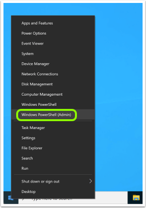 Click Right mouse button on Start button → Windows PowerShell (Admin):