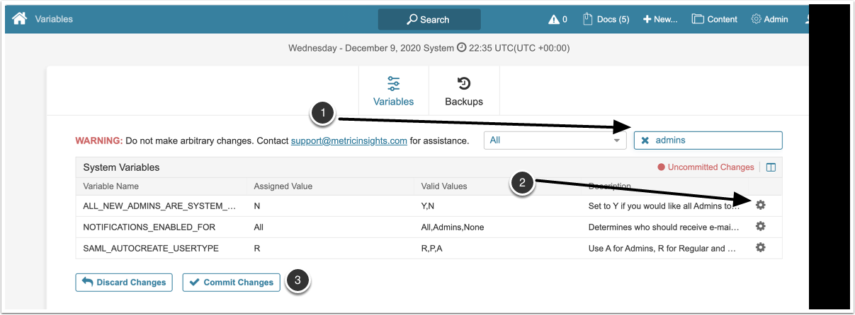 - When this Admin logs in, the options to reach the Admin > System > System Variables or System Backup pages are is available. This Admin can - Edit the User Editor of an Admin who has System Admin set to "Yes" as well as other Users