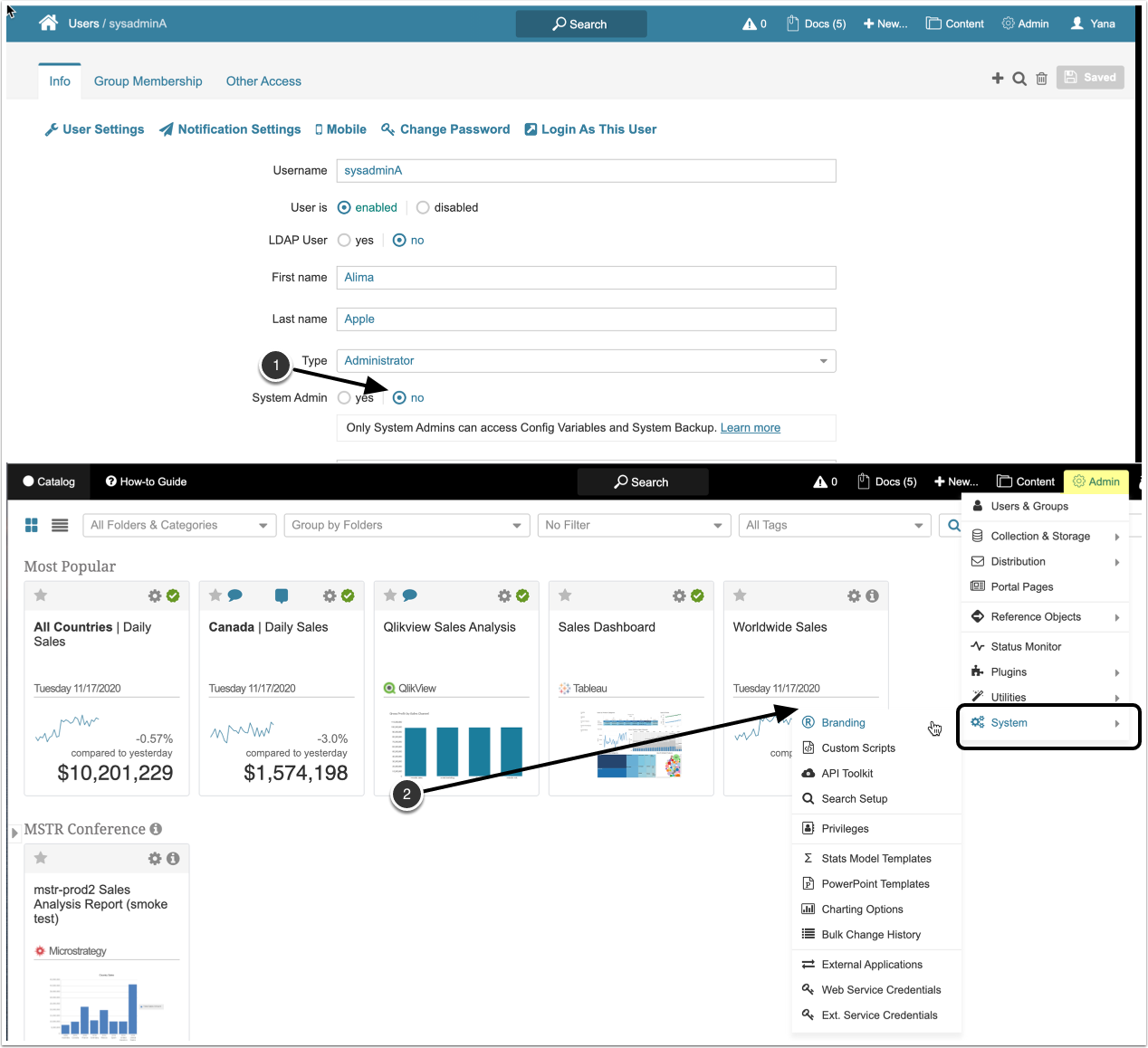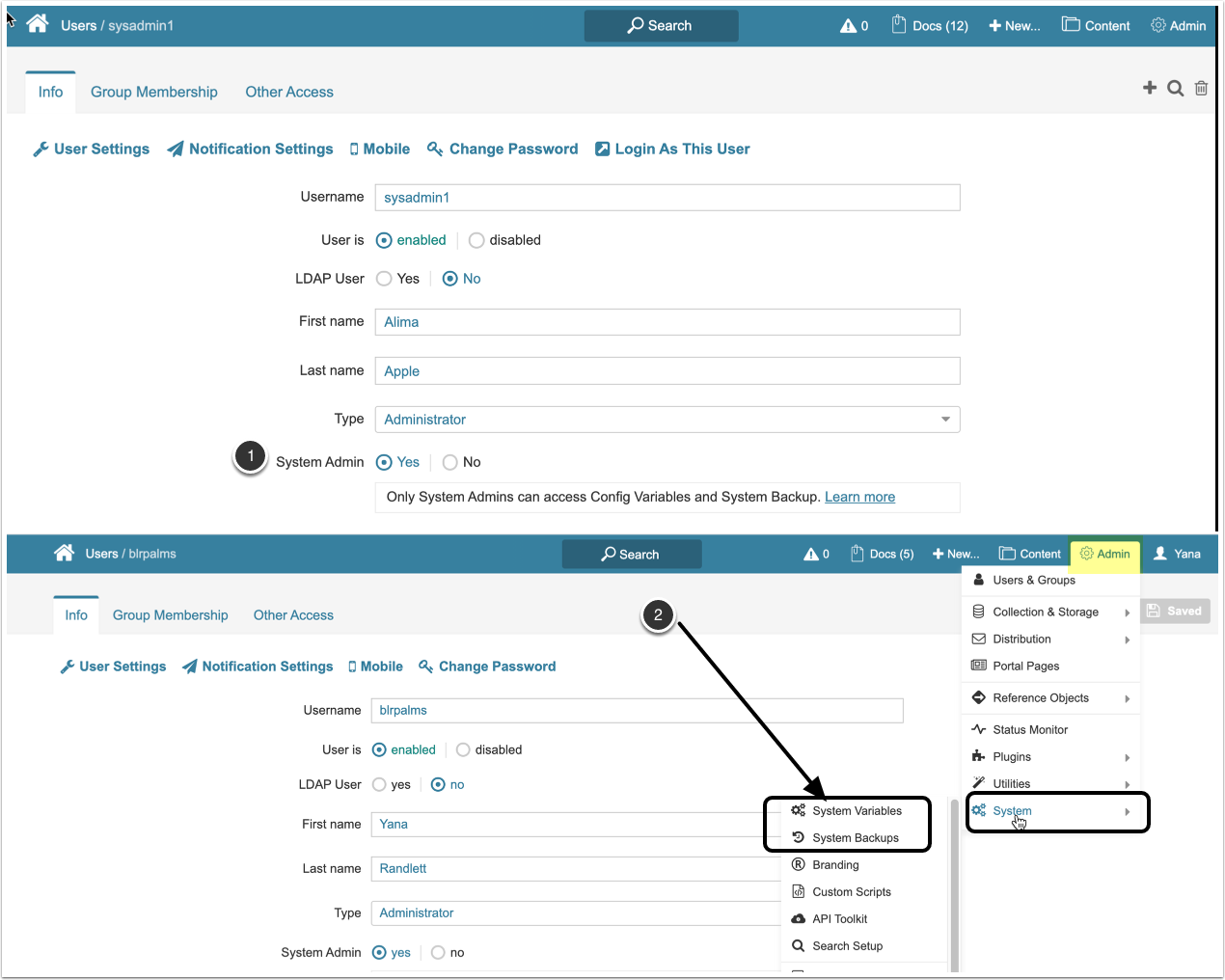 2. Make an Admin a System Admin: Admin > Users & Groups > Users > select an Admin or Create a new Admin > Info tab
