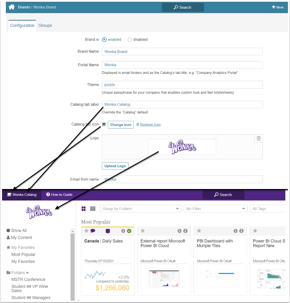 Branding allows you to change the icon next to the Catalog name and the logo image.