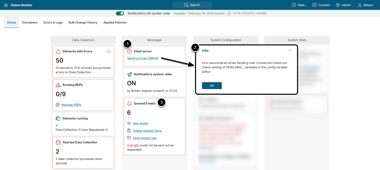 Error encountered when Sending mail: Network is unreachable Check setting of SEND_MAIL_ variables in the config  variable editor.Cause: Incorrect value for SEND_MAIL_SERVER, SEND_MAIL_PORT
