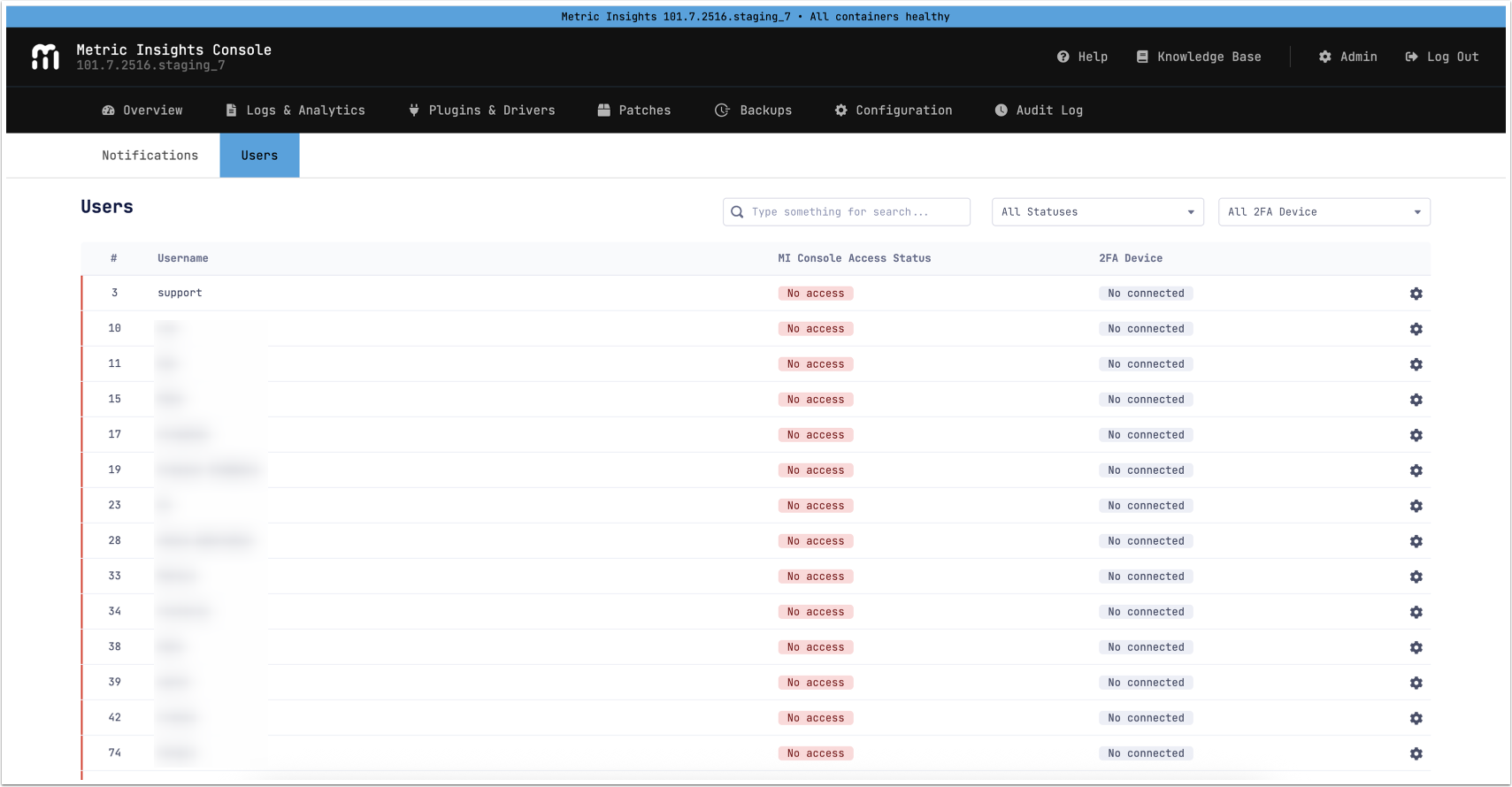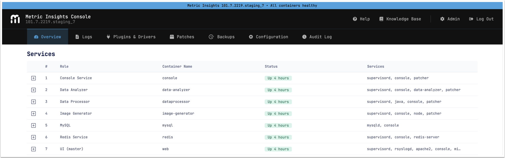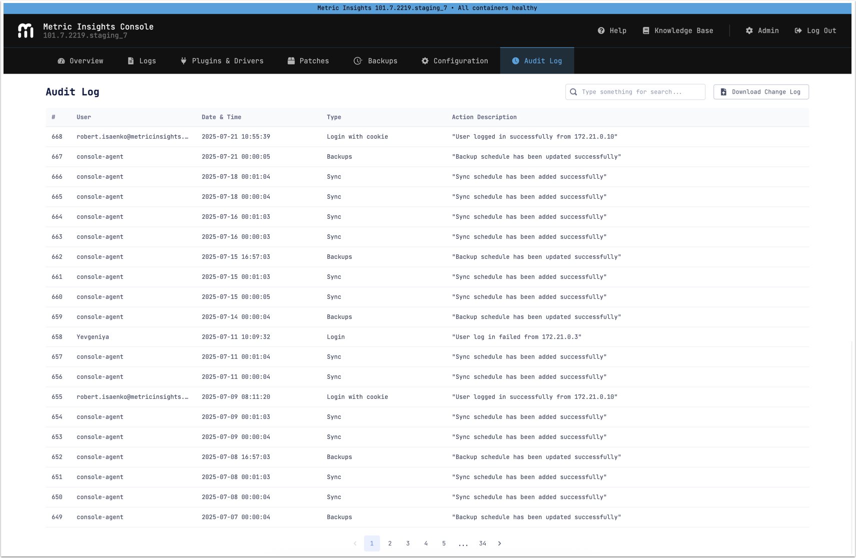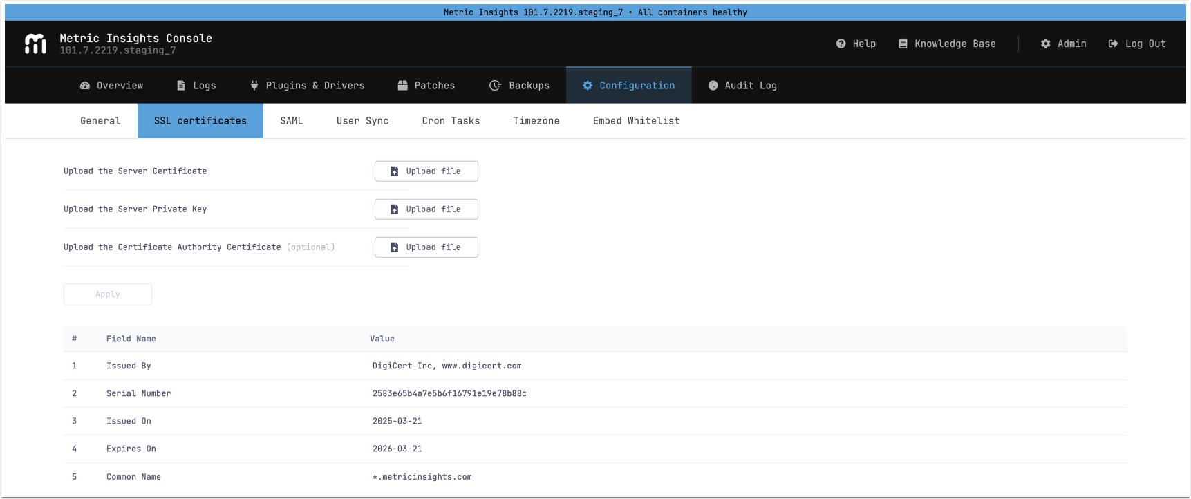 Introduced in version 7.0.1, the MI Console is designed to bring most of the command-line functionality into a user-friendly interface, making it easier to administer the Metric Insights application. Key tasks, such as managing SSL certificates, authentication settings, user synchronization, and backups, can now be handled directly through the UI. Future updates will continue to expand these capabilities to ensure that nearly all administrative functions can be managed through the MI Console.