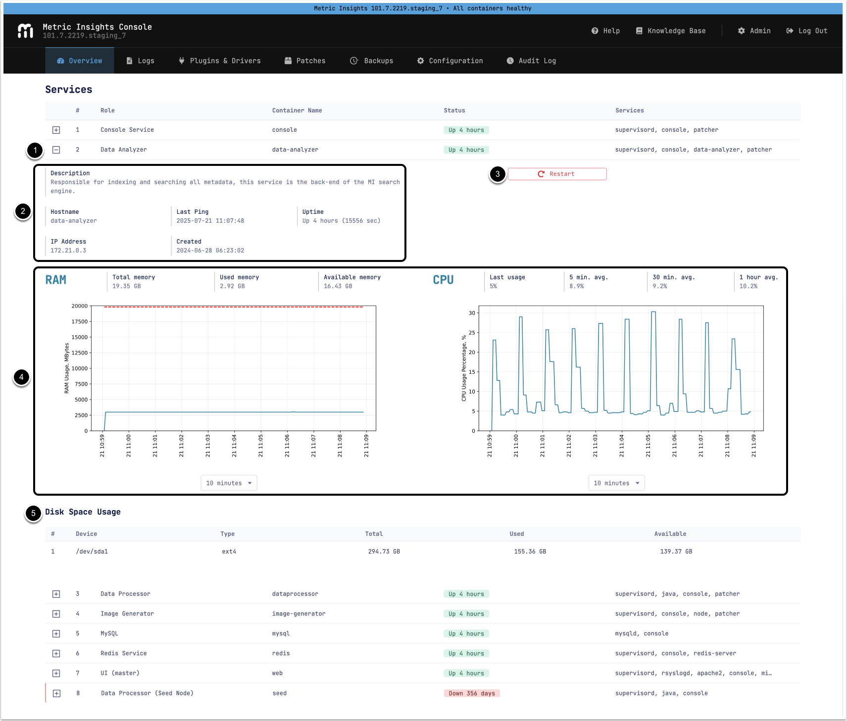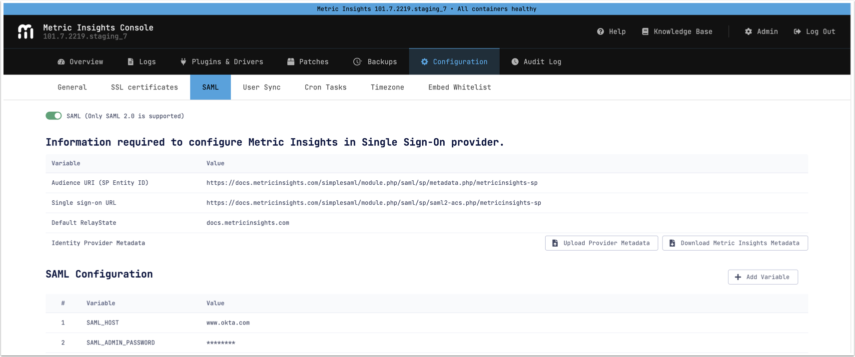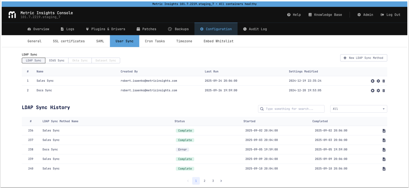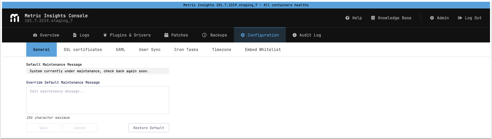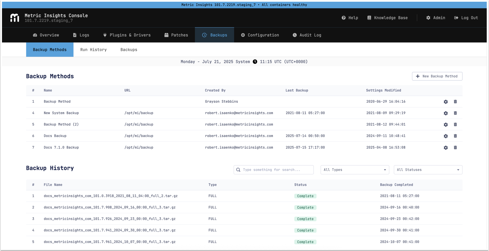 Introduced in version 7.0.1, the MI Console is designed to bring most of the command-line functionality into a user-friendly interface, making it easier to administer the Metric Insights application. Key tasks, such as managing SSL certificates, authentication settings, user synchronization, and backups, can now be handled directly through the UI. Future updates will continue to expand these capabilities to ensure that nearly all administrative functions can be managed through the MI Console.
