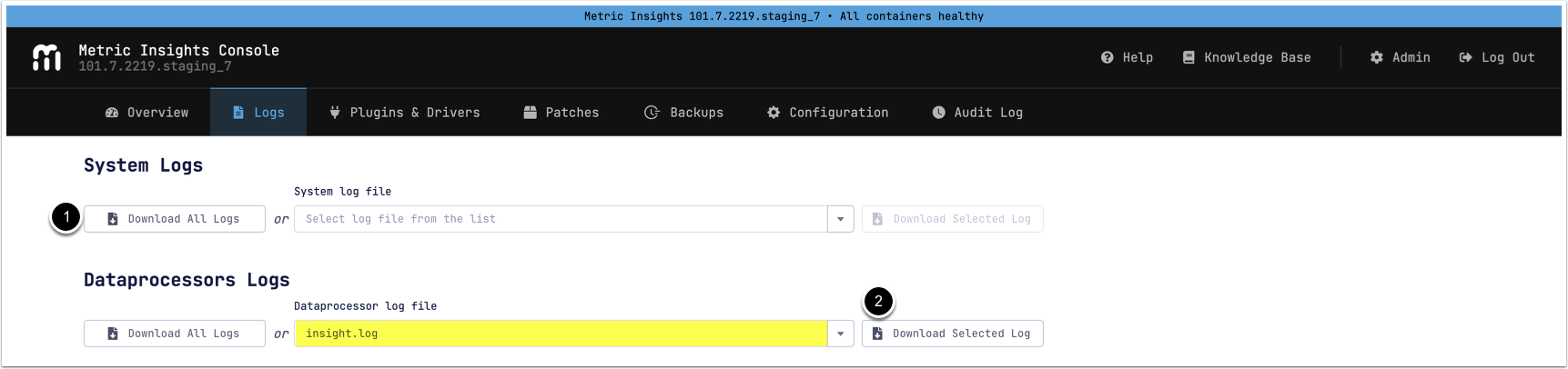 NOTE: System Logs contain logs from opt/mi/log; Dataprocessor Logs contain logs from opt/mi/log/dataprocessor.