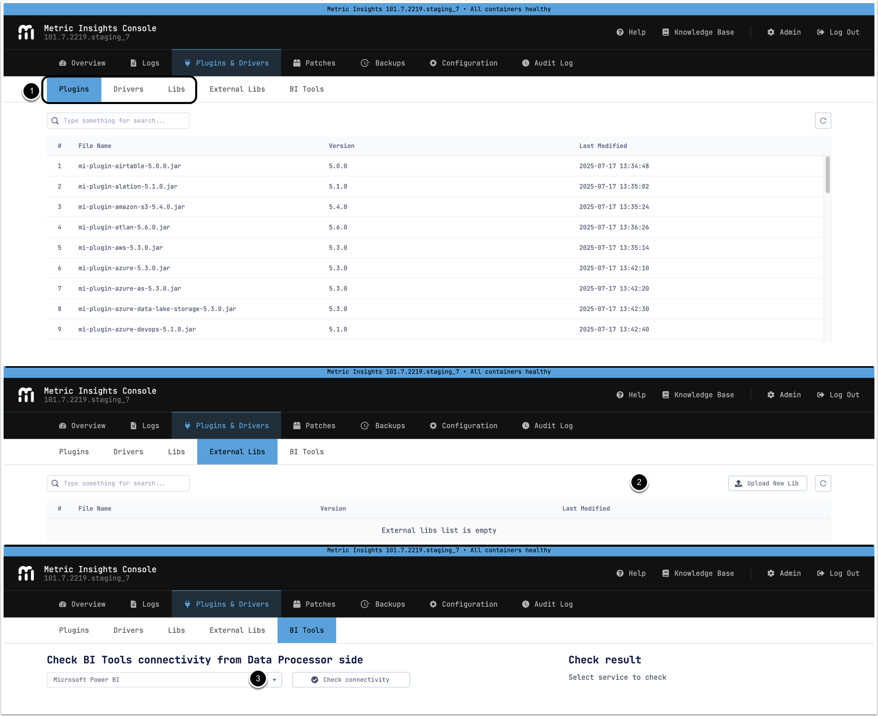 - The first three tabs display information about the Plugins, Drivers, and Libs used by the MI application.