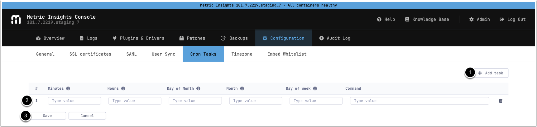 - Fill in the cron task details. Hover over the information icon to see the accepted format and values for each field.
