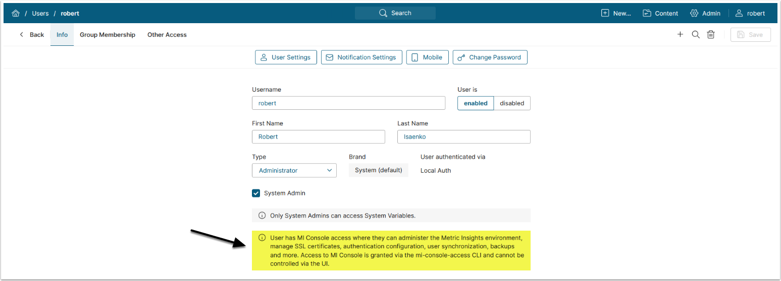 If access has been granted, a note will be displayed indicating that the user has MI Console access.