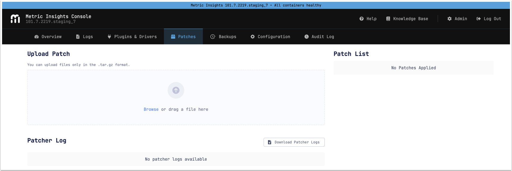 On this tab, you can upload patches, view a list of the applied patches, and download Patcher logs.