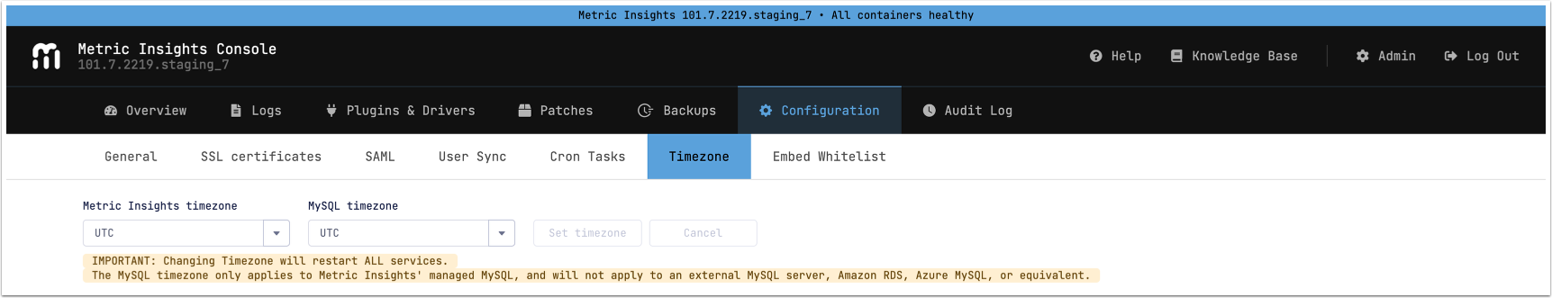 - Changing the Metric Insights timezone specifically will restart all services, including the MI Console and Chatbot.