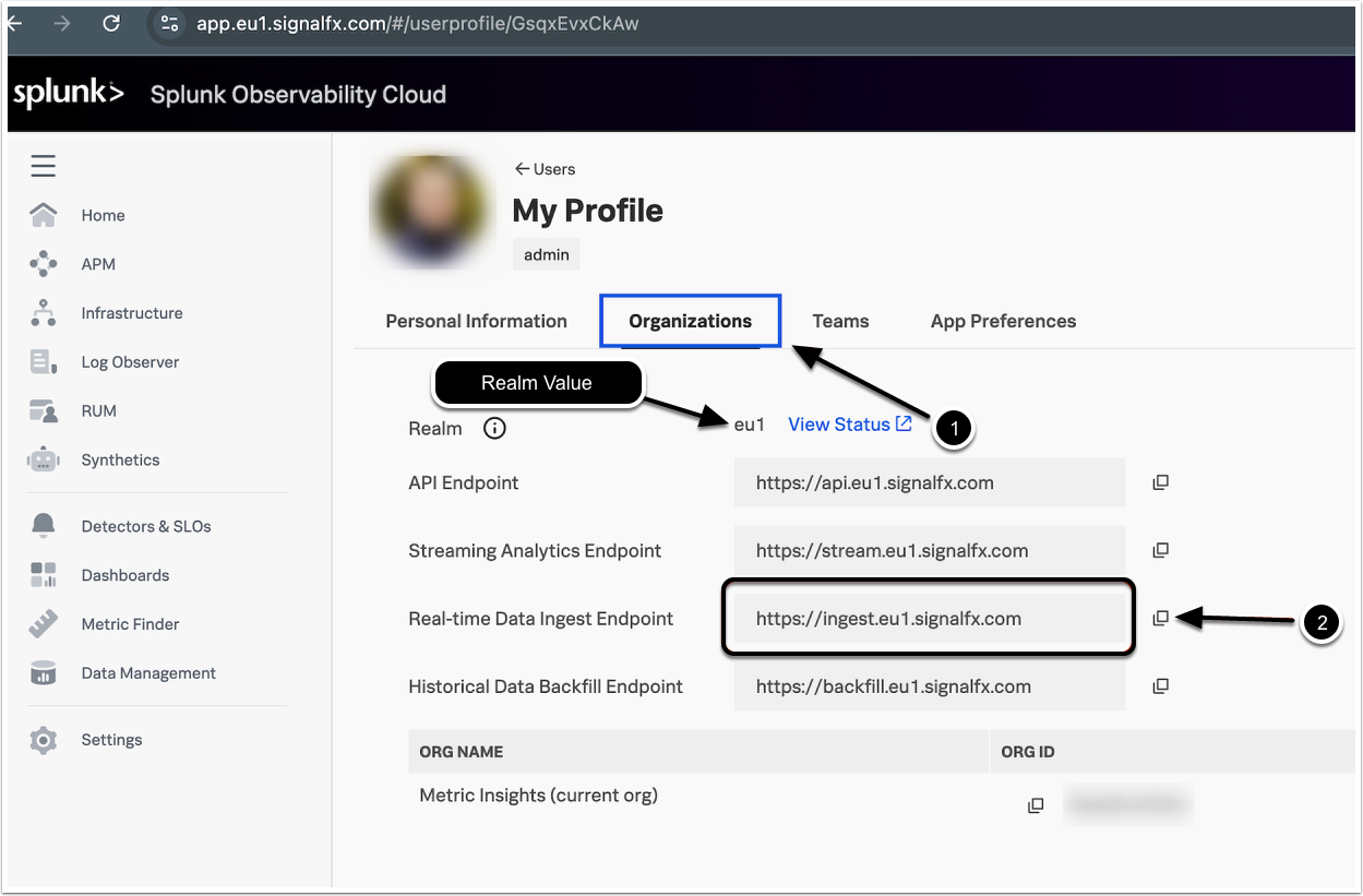 - Copy the Real-time Data Ingest Endpoint value, it is required for the environment variable OTEL_EXPORTER_OTLP_TRACES_ENDPOINT- Copy the Realm value as well.