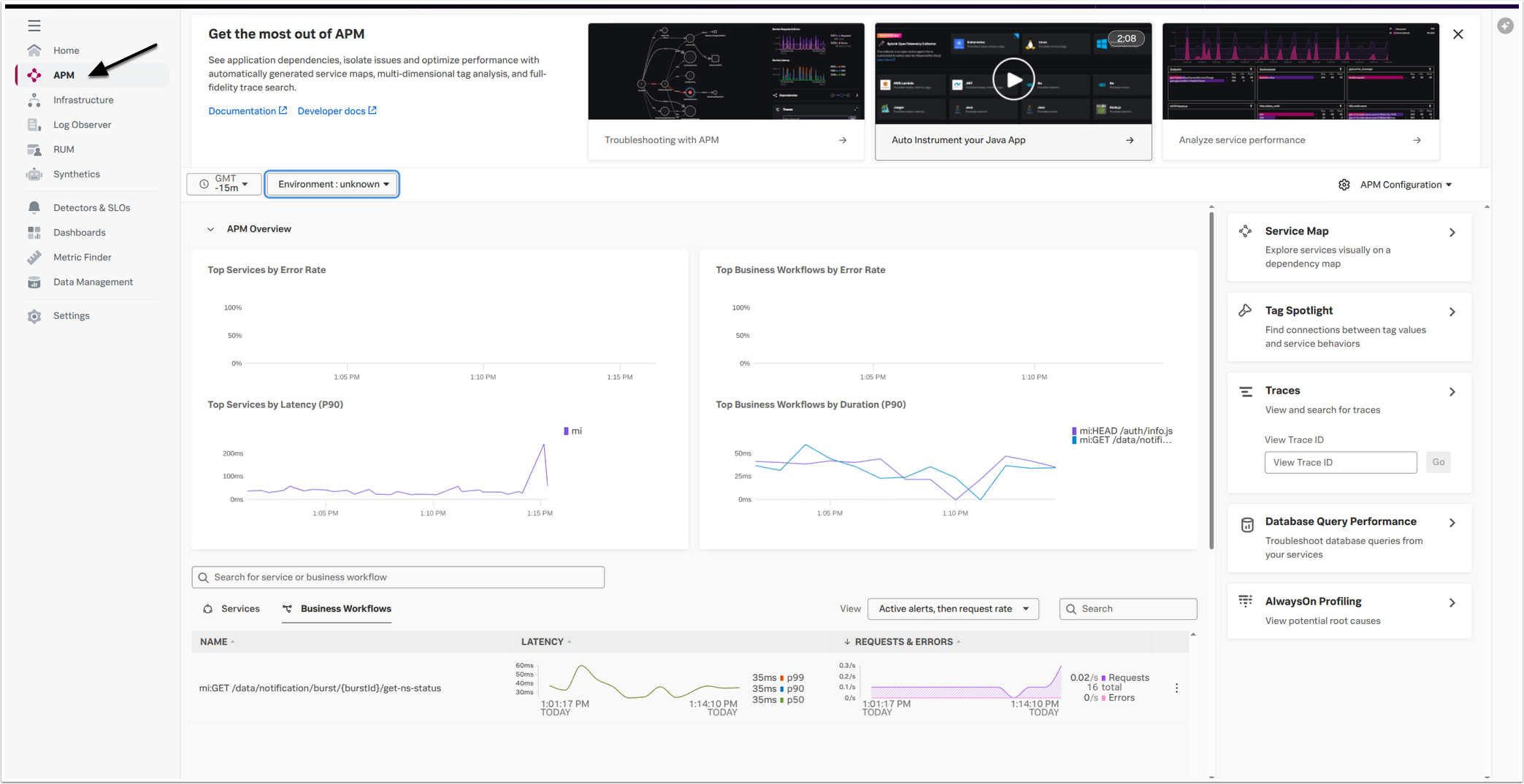 - Log in to Splunk Observability Cloud and navigate to the APM (Tracing) section or relevant dashboards. - Use the service name you configured (e.g., "metric-insights") to filter or search for traces and metrics.