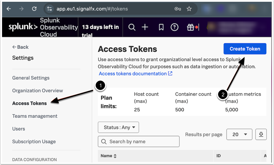NOTE: If you don’t already have one, create a Splunk Observability Cloud account (a free trial can be obtained via Splunk’s website). Once logged in to the Splunk Observability portal, ensure you have appropriate admin rights to create tokens.