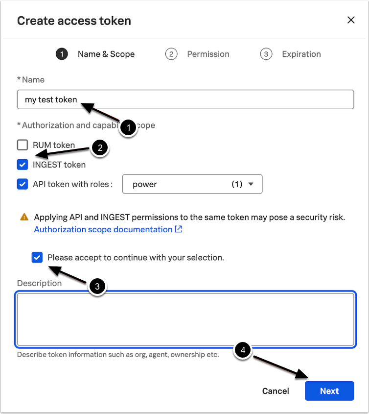 - Activate the INGEST token checkbox- This grants permission to send metric and trace data