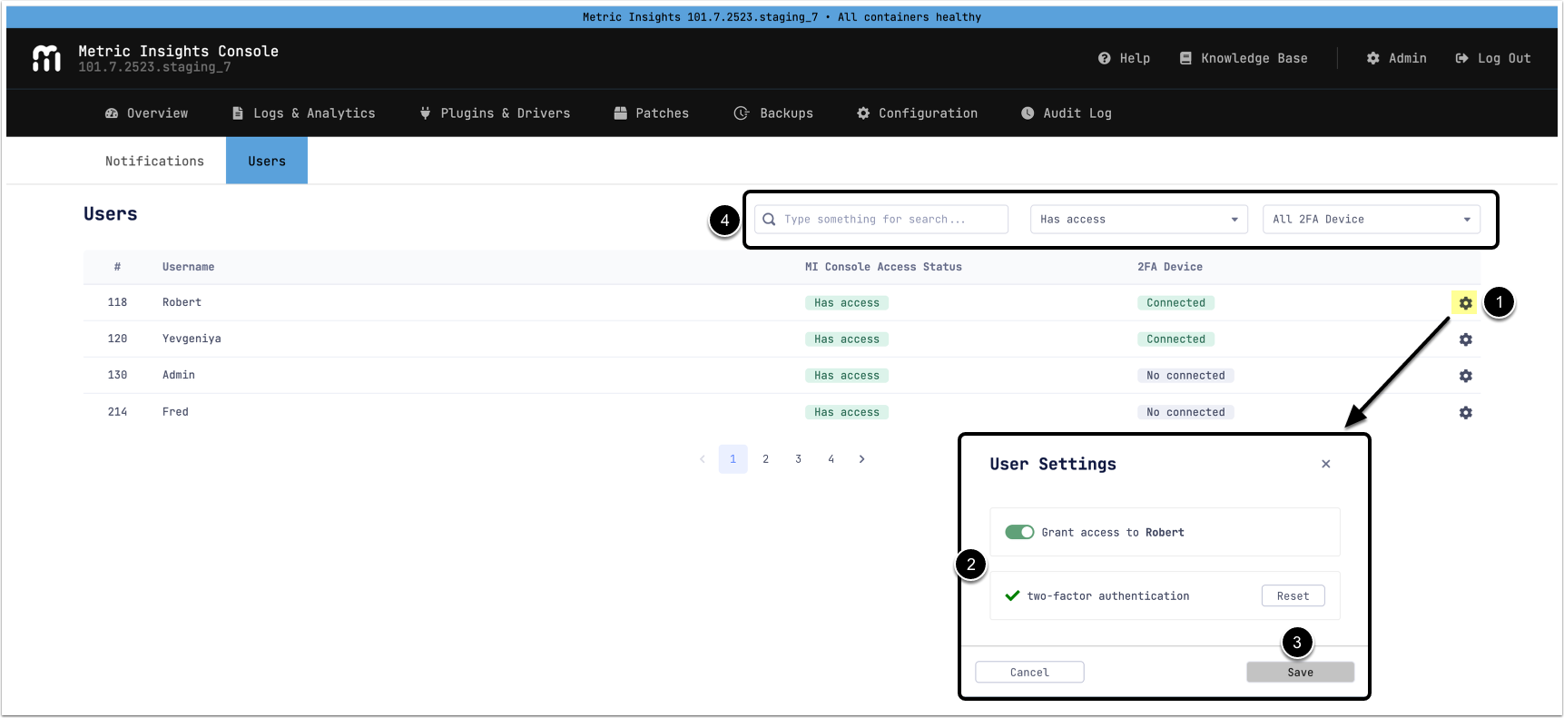 - Additionally, Users can be filtered by username, MI Console access status, and 2FA status.