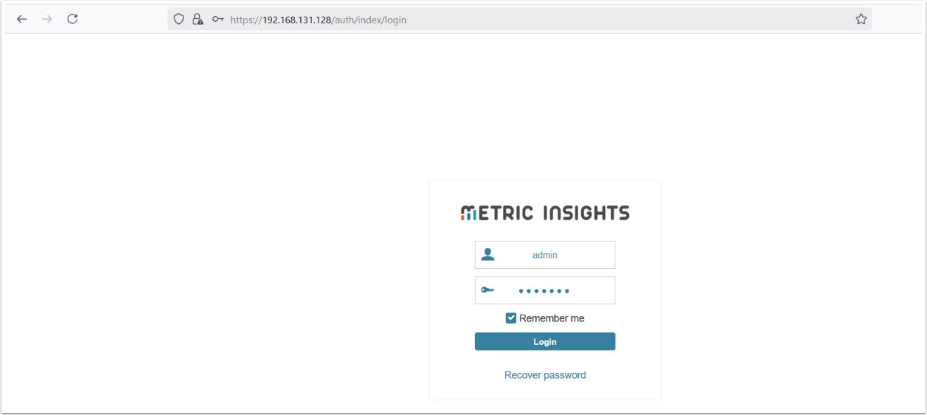 Open a web browser and put the IP address obtained above into the address bar. Depending on your browser you will likely get an SSL warning. This is because the Metric Insights server ships with a default self-signed certificate. You can just accept the warning and you will get to the login prompt:
