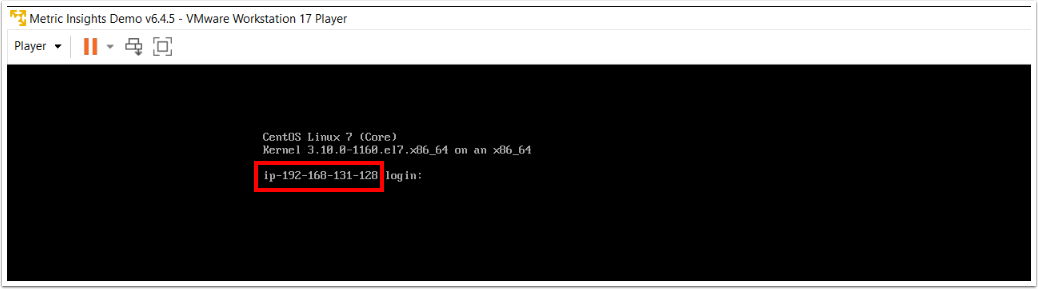 NOTE: If you do not get an IP address here, the Metric Insights server was not able to get an ip address from your DHCP server. If this happens you will need to set the Network Adapter to use NAT addressing or talk with your local Network Administrator.