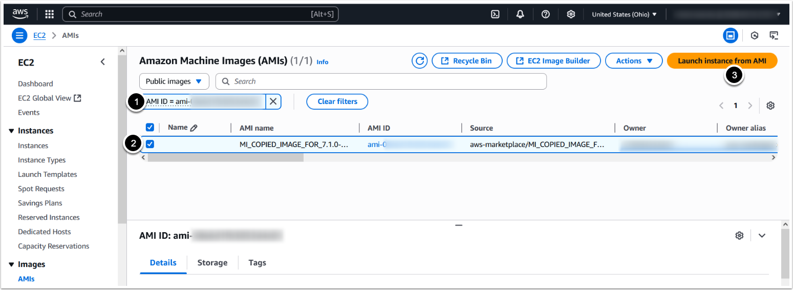 - In the AMI list, insert the AMI ID in the search bar and select 'Public Images'.