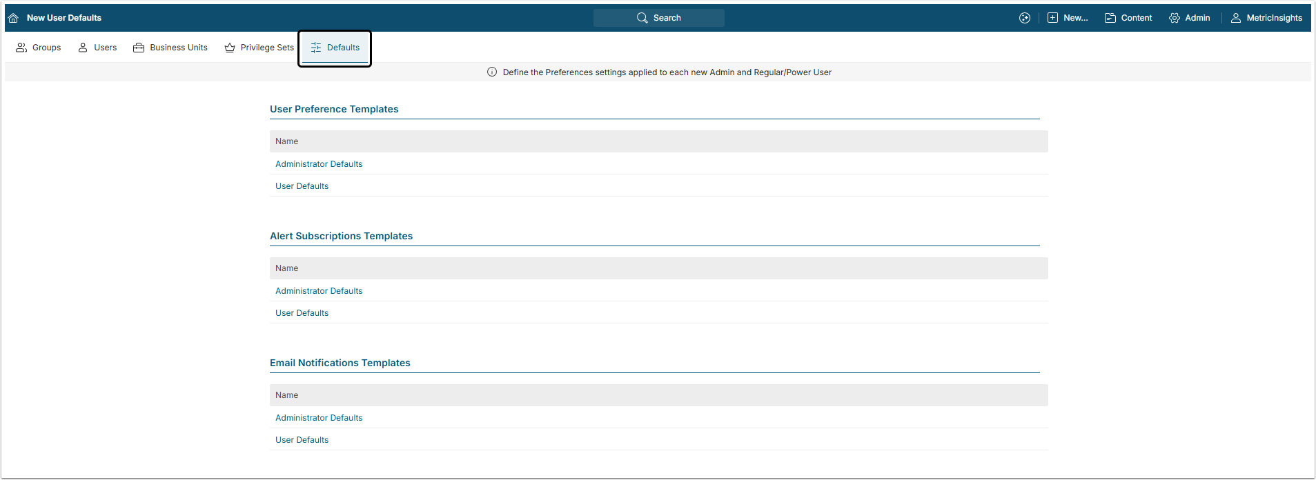 Each these will have separate screens for defining defaults for Admin and Regular Users.