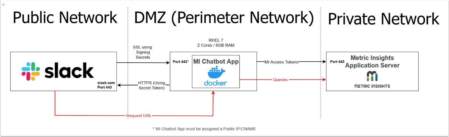 As an external-facing app, the MI Chatbot must be accessible from the internet. DMZ deployment allows the Bot app to be reachable from the Public Network, while the data it queries from Metric Insights remains securely locked within a Private Network.