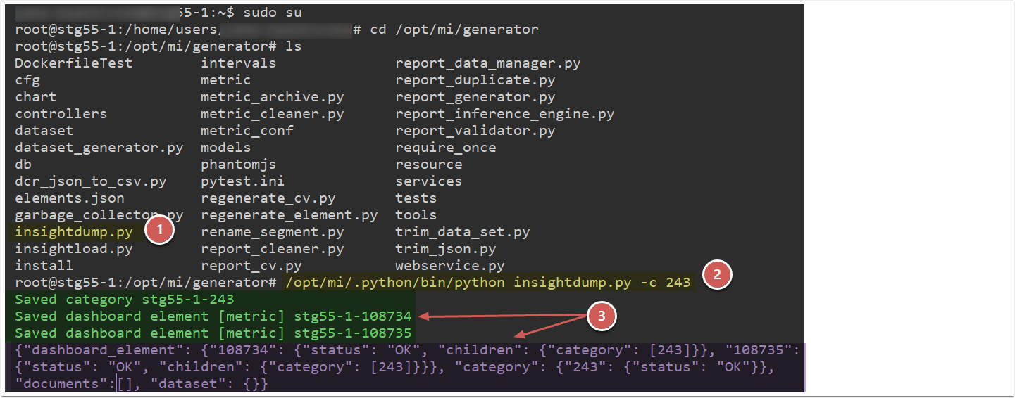 - Run the command /opt/mi/.python/bin/python insightdump.py -c 243 (where -c represents Category followed by Category ID)- Alternatively, use sudo /opt/mi/.python/bin/python /opt/mi/generator/insightdump.py -c 243