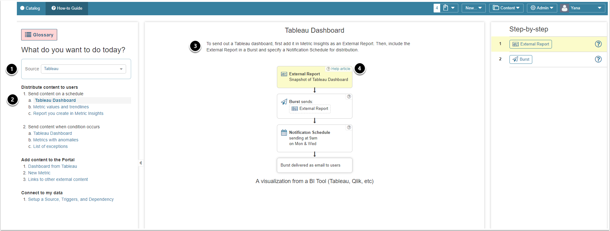 The "How-to Guide" will lead you through the process of using popular BI tools as Data Sources within the Metric Insight Portal. The Guide's Glossary will help new Users get familiar with the key concepts related to Content creation and its distribution.
