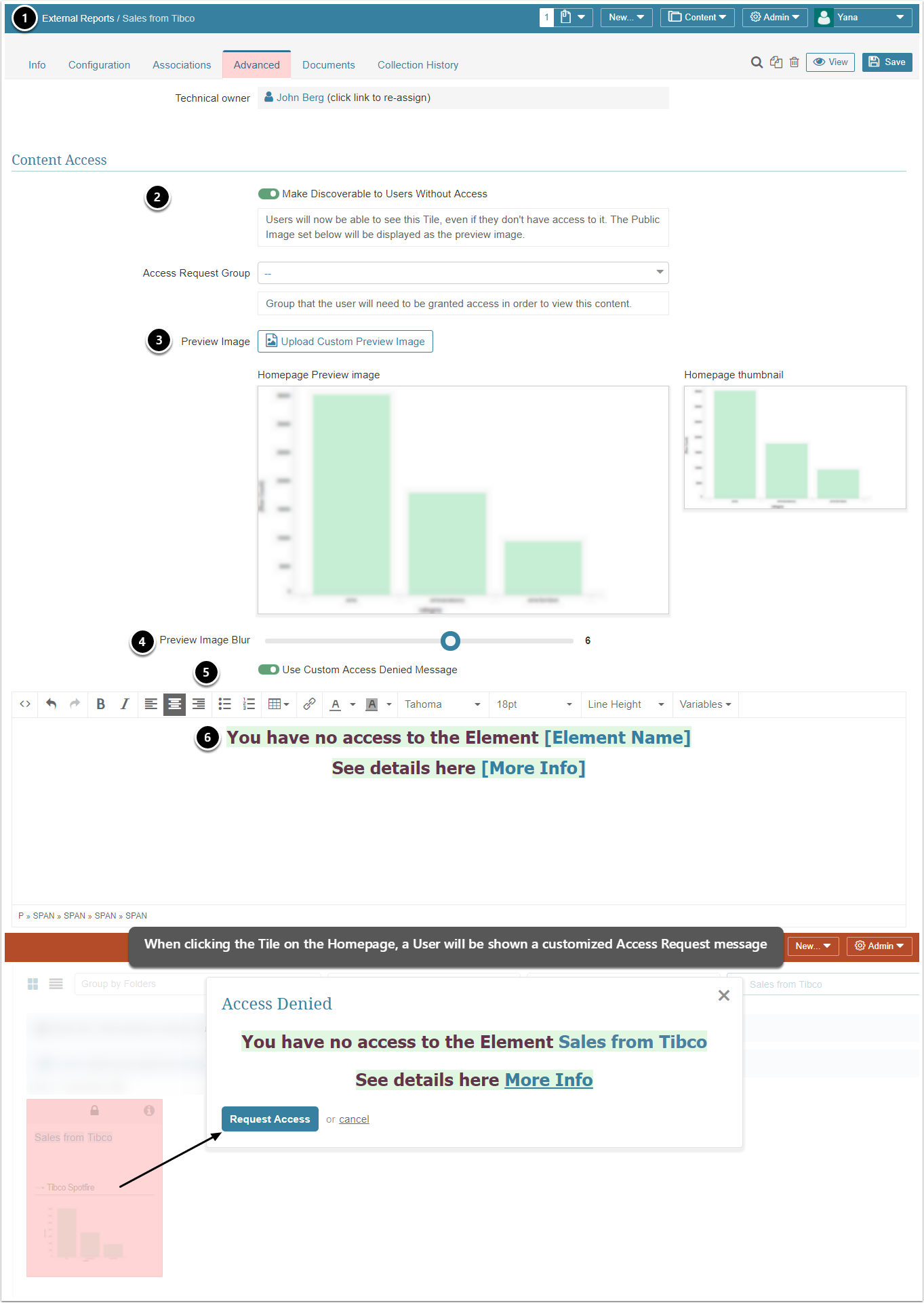 Improved content discoverability functionality aims at making User interactions with inaccessible content streamlined and user-centric via: - Custom Access Denied messages for multi-tenant environments, wherein different teams require different messages when content is not accessible.
