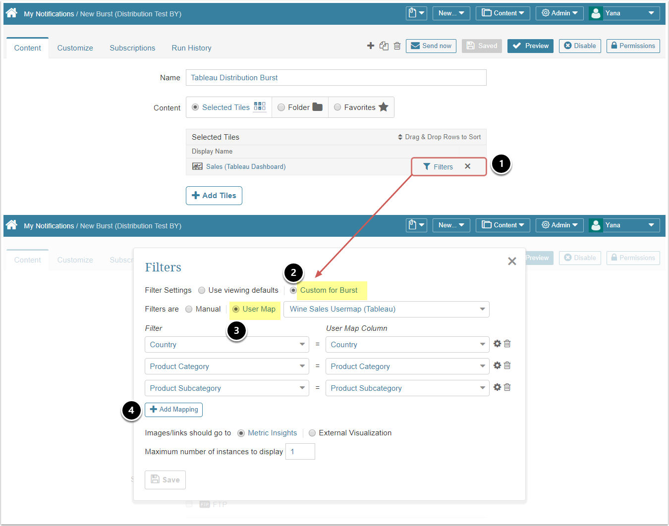 - Bursts can be configured to pass the correct Filters and Filter Values to the correct Users, personalizing all delivered content, but only requiring a single Burst, a single External Report, and a single User Map (all working together).