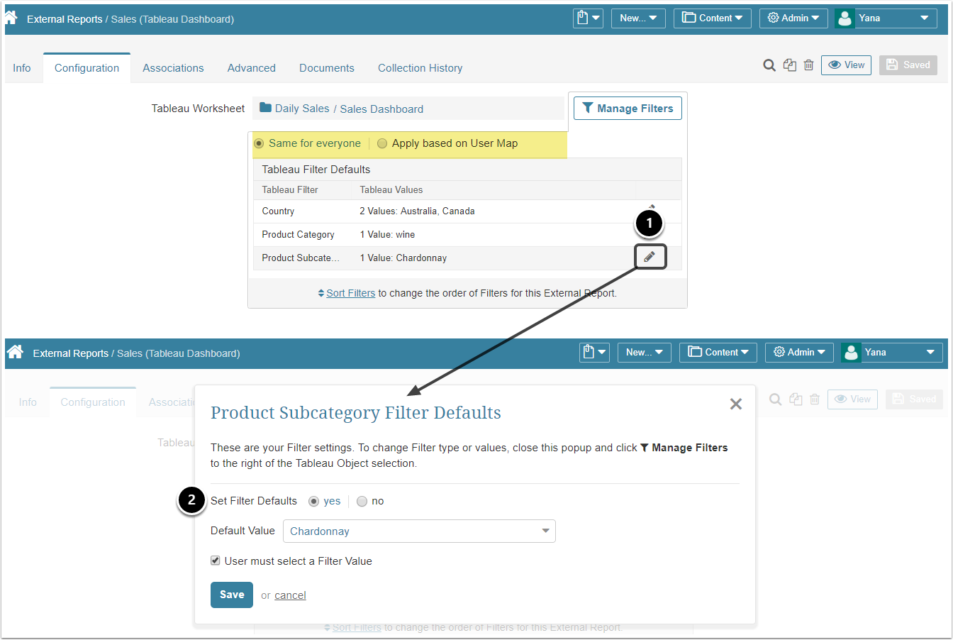 Configuring defaults allows content builders or administrators to define Filter settings either in a way that is the same for everyone, or apply them based on a User Map. Consequently, any number of Users will have the correct Filter Values when they open their External Report.