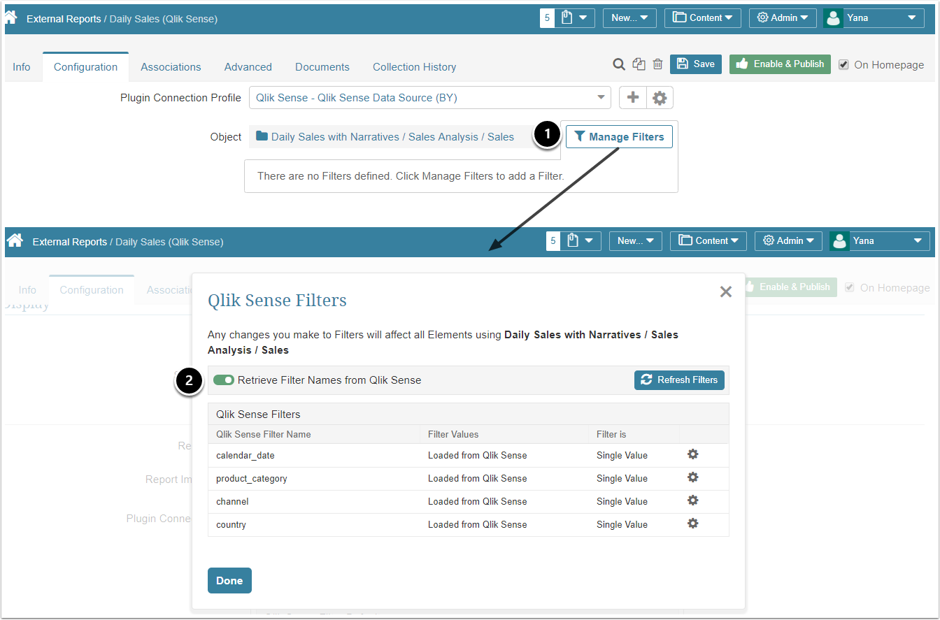 The Qlik Sense API enables automatic retrieval of Filters and Filter Values.