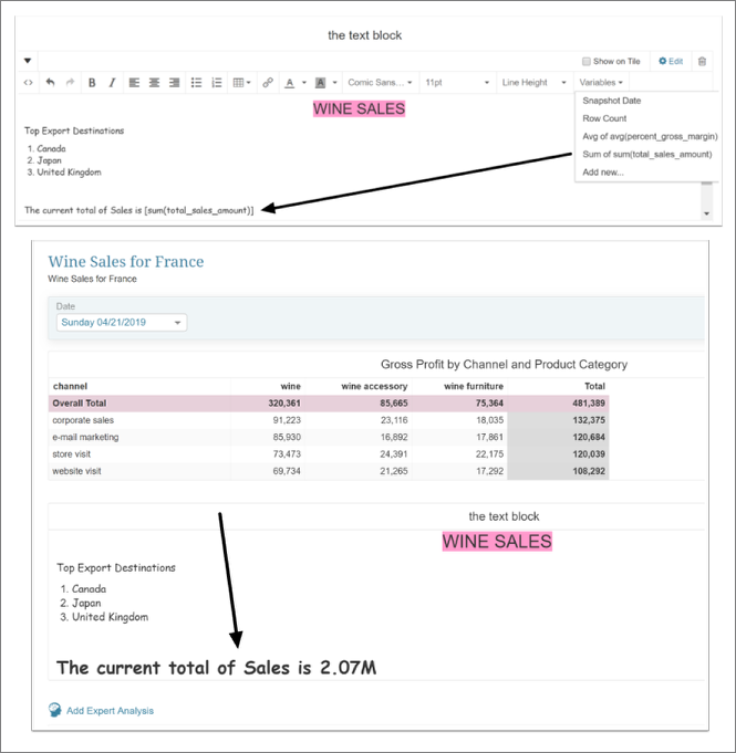 Users can now build formulas that are calculated based on the column data in a Dataset Report, and display these as Variables that can be included in the Text Block component.