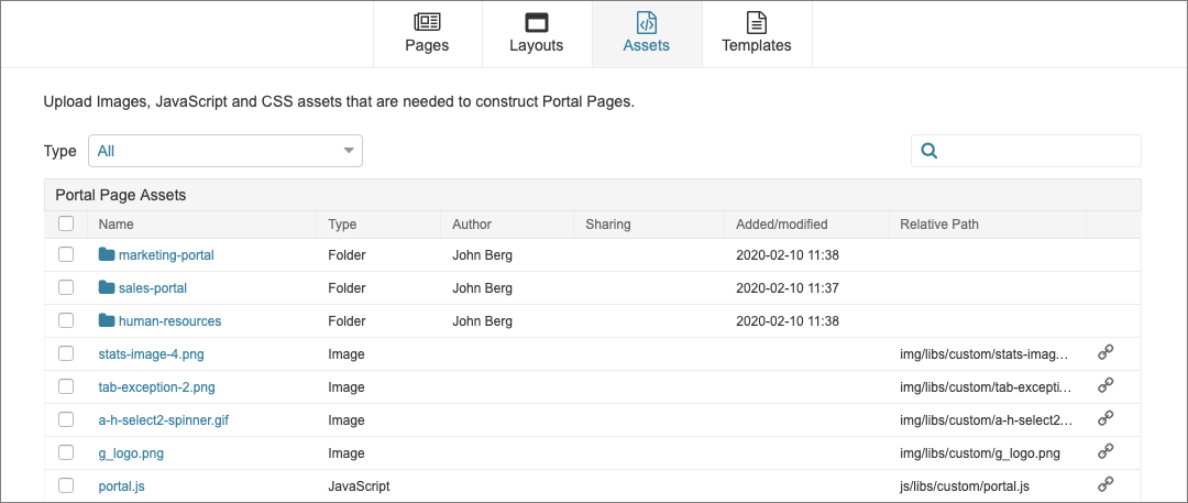 We have introduced Asset Folders to ease the management of the Assets utilized in the construction of Portal Pages. These can be shared explicitly with Users or Groups intended to manage a particular Portal Page. To review associated Security changes, see Portal Page Security