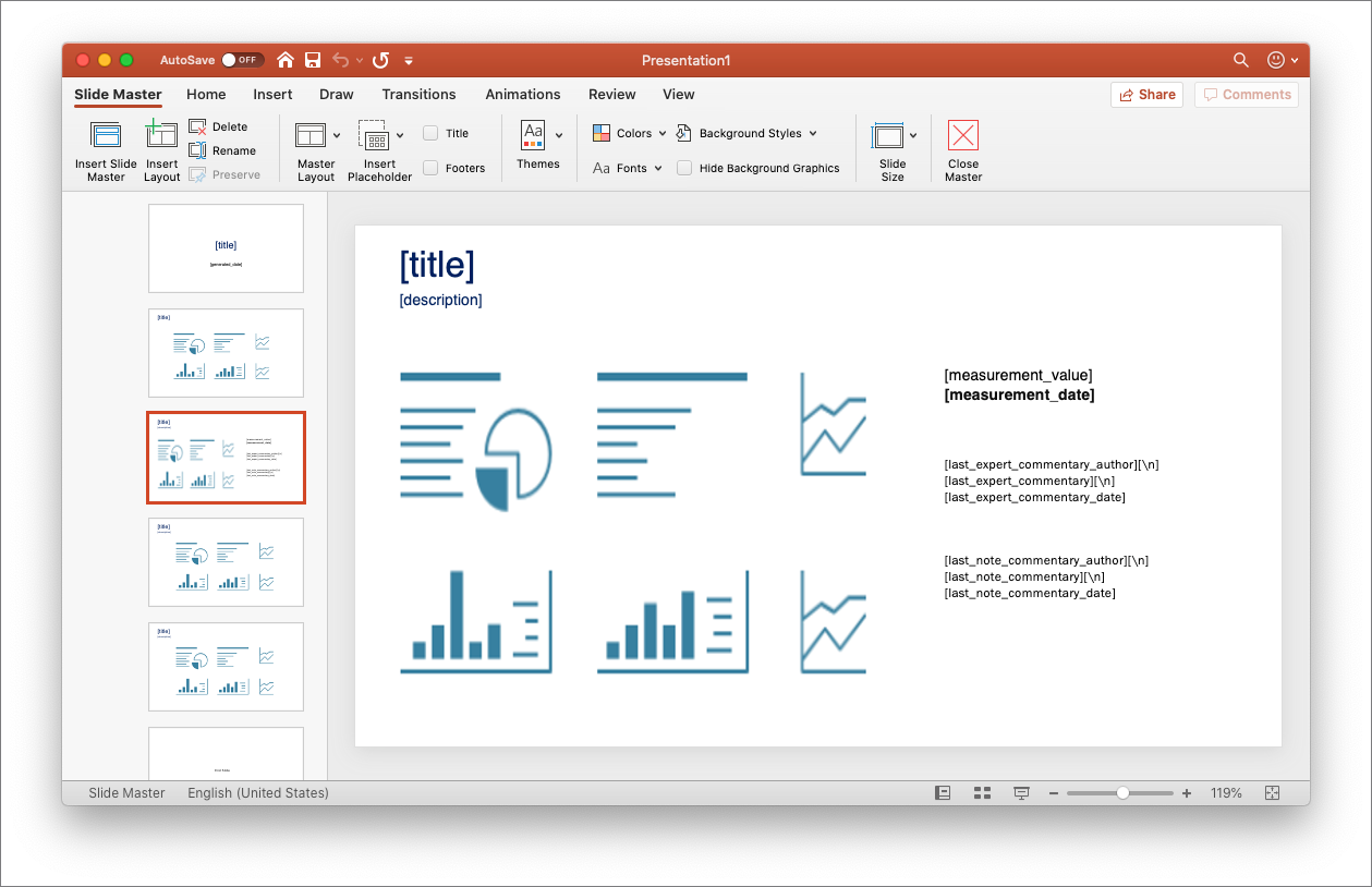 We have completely rearchitected our support for custom PowerPoint templates. The functionality has been simplified to a common set of variables that can be included in a POTX. Once setup in PowerPoint, the template is uploaded to Metric Insights. The template can then be selected when setting up a Burst or Favorites Folder and the PPTX that is subsequently generated will honor the custom template.