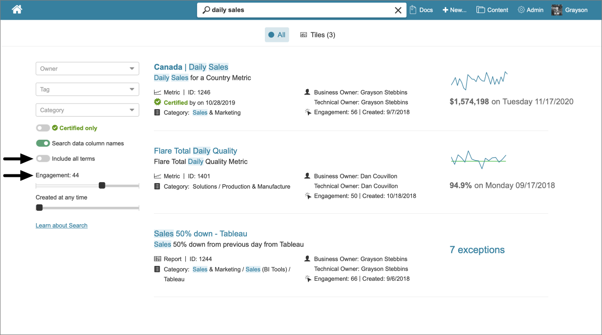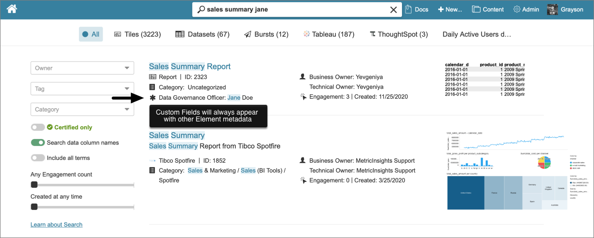 6.2.0 marked the launch of Intelligent Global Search—it has been designed from the ground-up to function like the leading search engines with core architectural similarities like crawling, indexing and scoring. You can search across both content within Metric Insights, external references to objects in BI tools, and Datasets that include links to any external system—you choose.