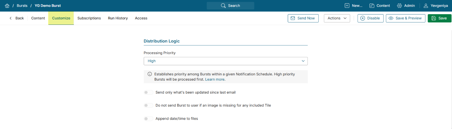 On the Customize Tab of the Burst Editor, you can now establish priority among Bursts within a given Notification Schedule. Processing Priority can be set to "High", "Medium", or "Low". High-priority Bursts will be processed first, which helps ensure that
