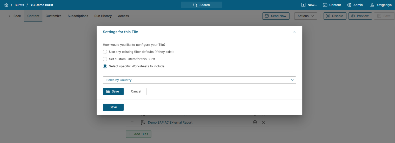 Similar to selecting Filters for External Reports in Bursts, you can now select individual Worksheets from Tableau Workbooks. Additionally, you can set the order you want the Worksheets to display. In this first implementation of the feature, filtering won’t be supported.