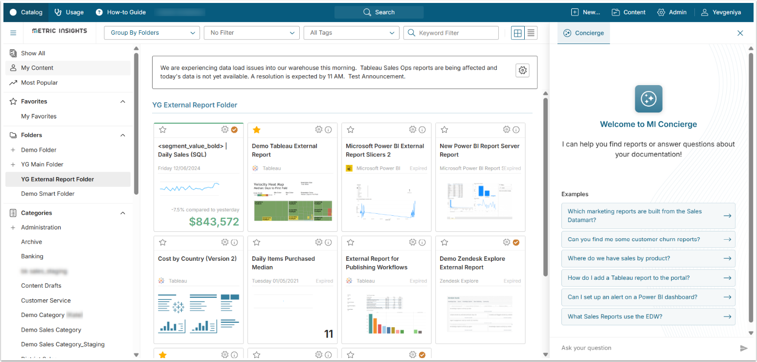 Metric Insights 7.1.0 is our first major release of 2025, packed with powerful enhancements designed to elevate how you discover, interact with, and govern your analytics assets. This release introduces the brand-new Analytics Marketplace, enabling seamless search and discovery across sources like Atlan, Alation, Collibra, Purview and more — all from a single interface. Our fully integrated Concierge AI Assistant is now live, offering smart, intention-aware answers to search queries and support-related questions like "What's the process for on-boarding a new report?"