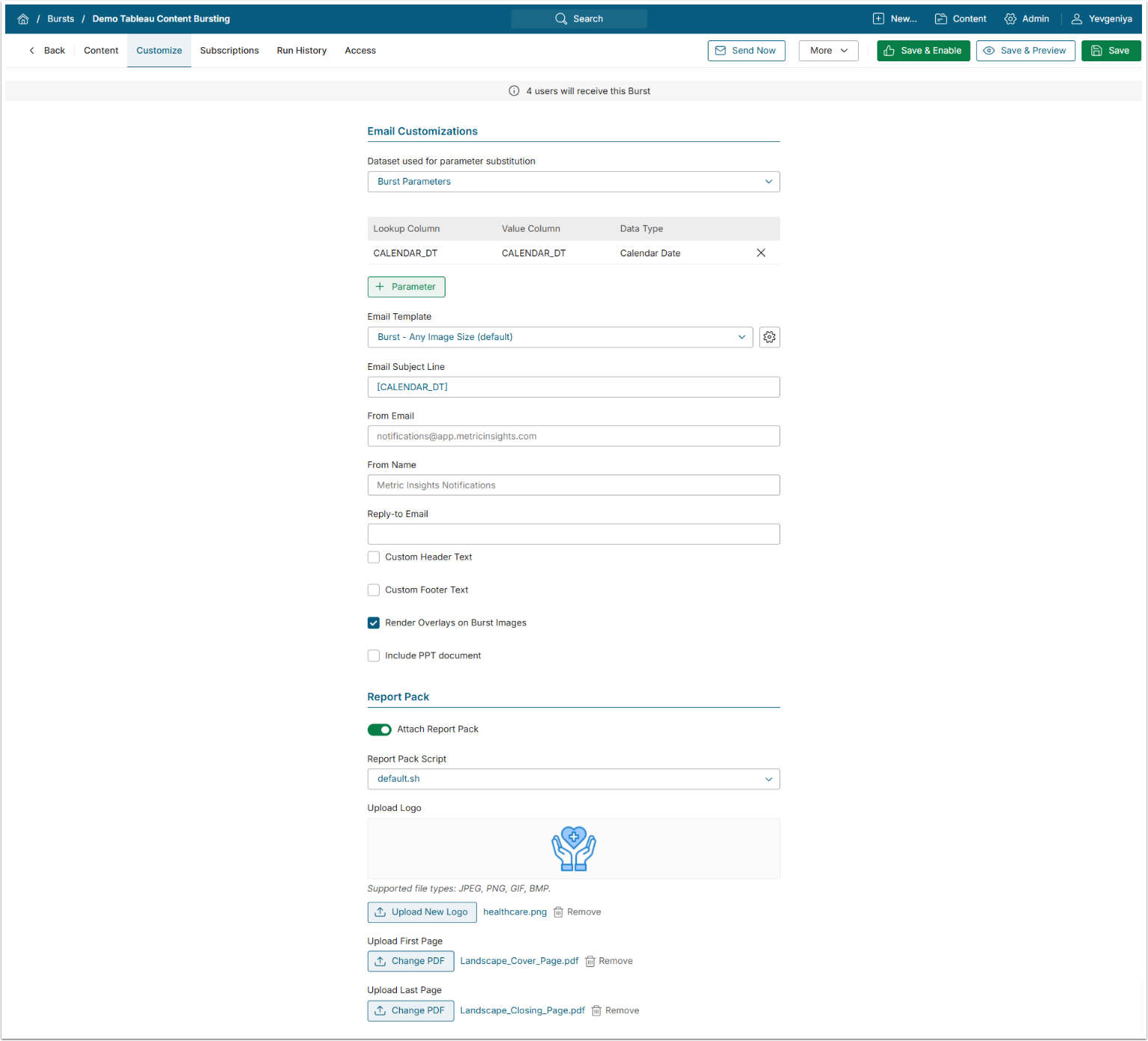 Bursts have been supercharged with support for PDF Report Packs and parameterized subject lines, headers, and footers.