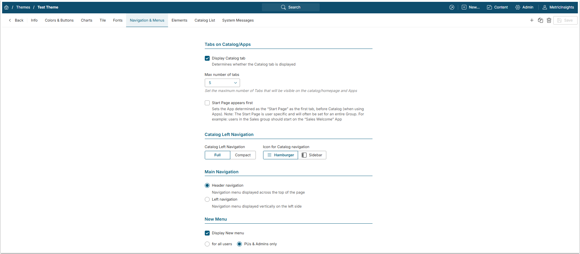 - The Menu tab has been renamed to Navigation & Menus, providing greater flexibility for customizing the Catalog tabs, start page, left navigation design, and the New menu display.
