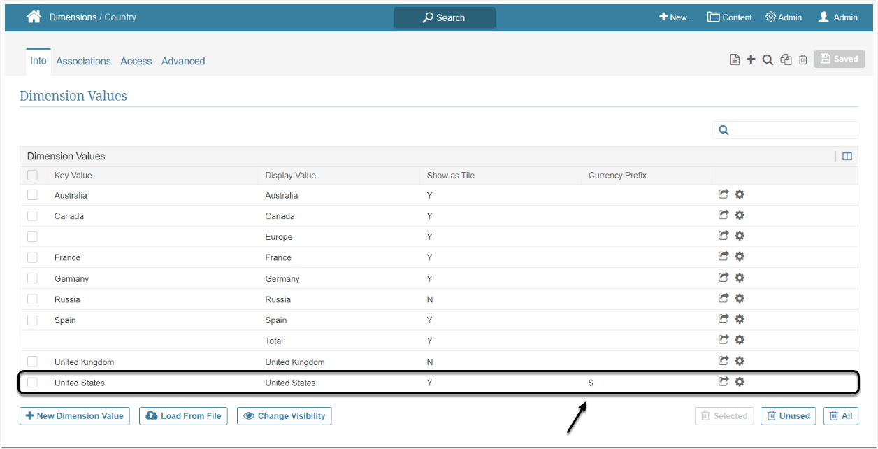 When you assign a Currency Prefix to a Dimension Value, if the required currency symbol is not already defined, it can be added. For details, see Add a New Currency Symbol article.