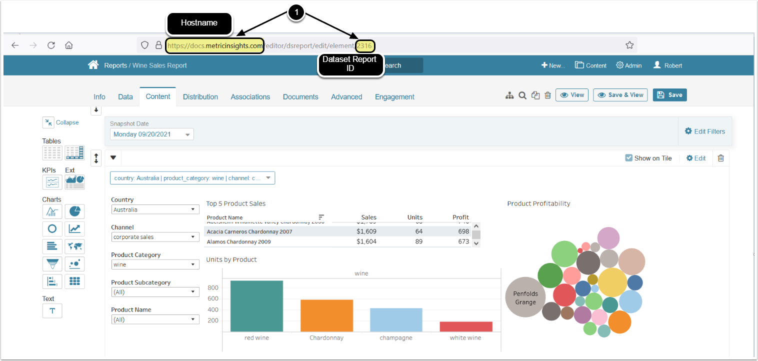 - Copy the hostname and Dataset Report ID from the URL in Dataset Report Editor or Viewer