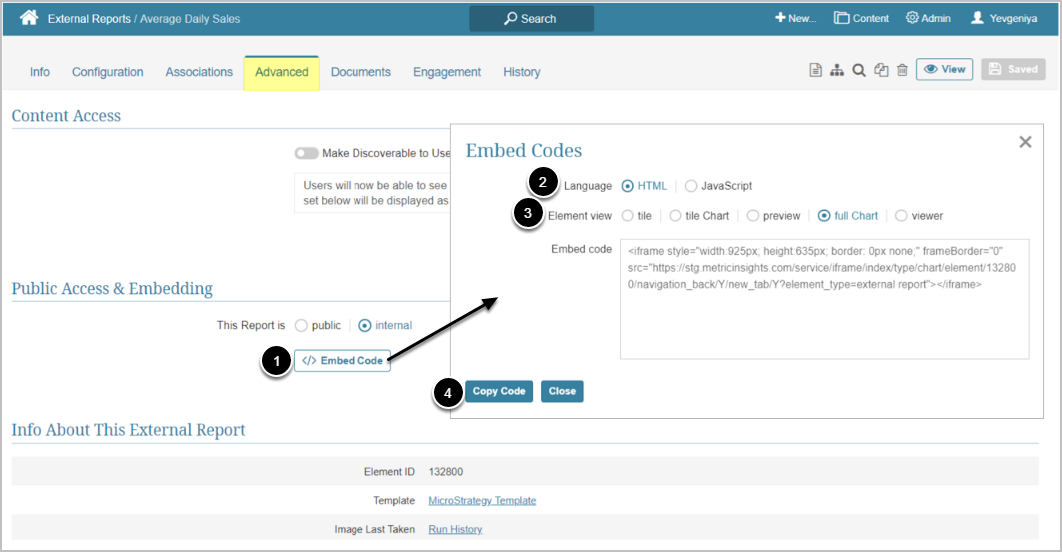 This article describes how to embed External Report as an example. For more details on how to find embed codes in Metric Insights, see Embedding Overview.