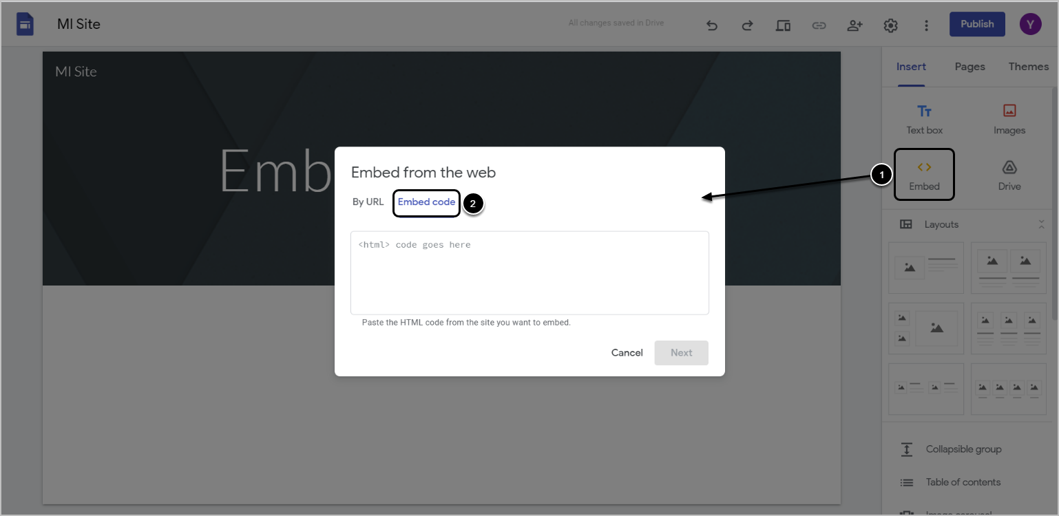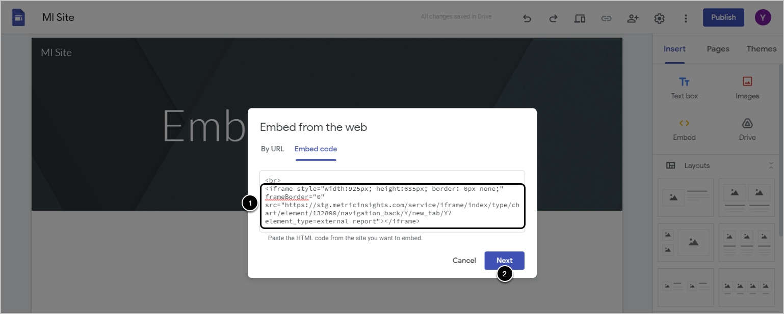 This article details how to embed MI content into a Google Site. There are two ways available.