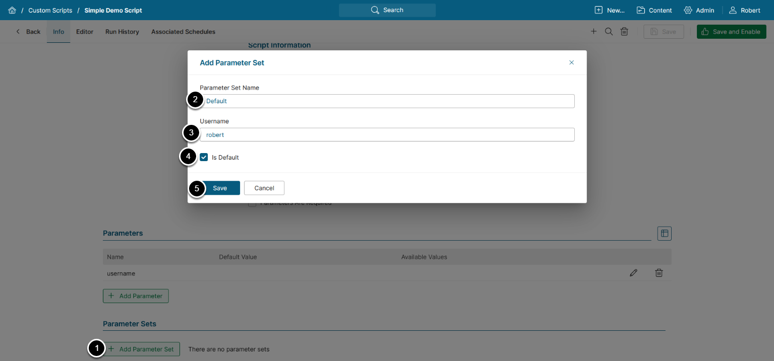 Parameter Sets are especially useful when a Custom Script needs to be executed with different Parameter values. They represent sets of values assigned to Custom Script's parameters. To add a Parameter Set: