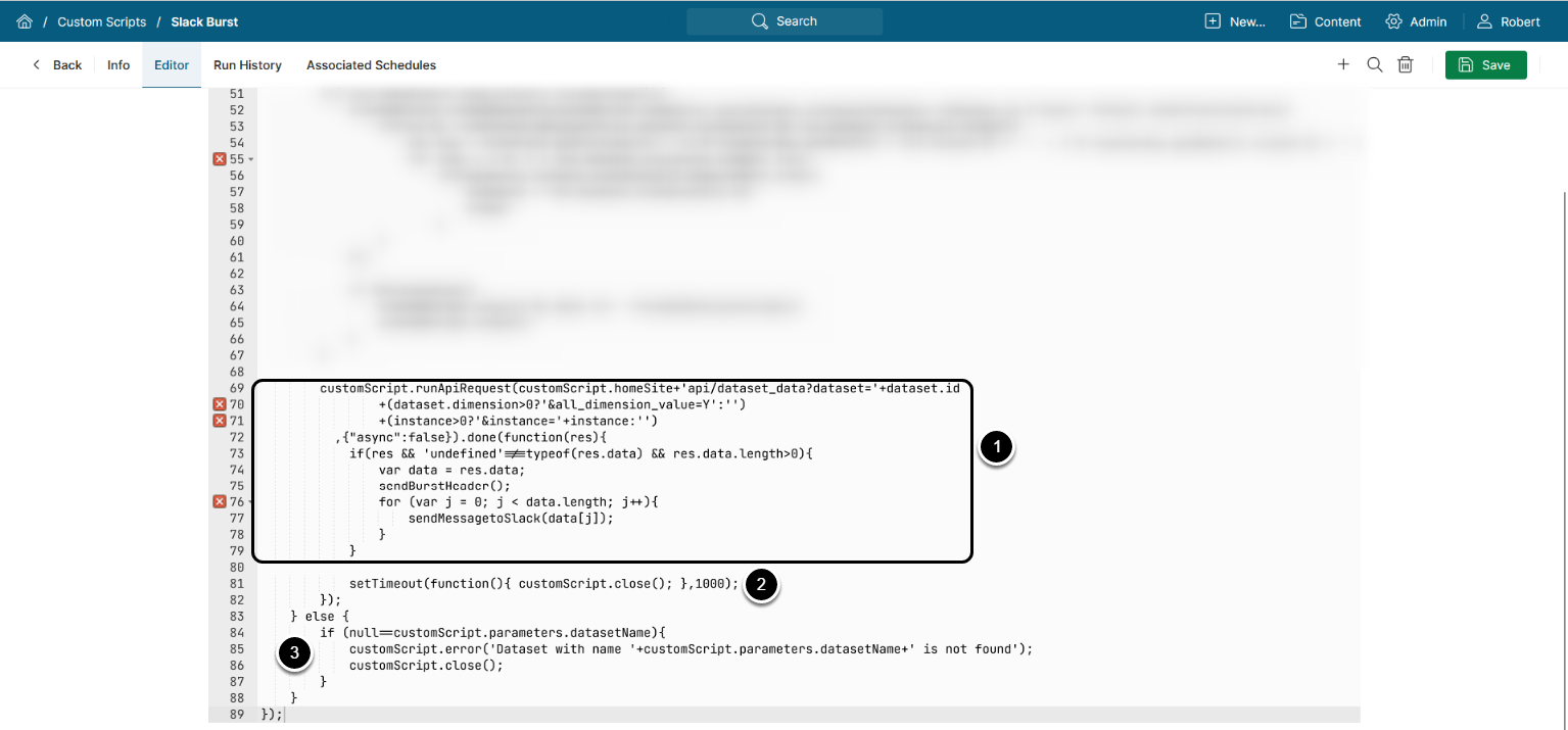 Let's consider a more complex use case on the built-in Slack Burst example, where the Dataset's data is sent to a Slack channel via the Custom Script.