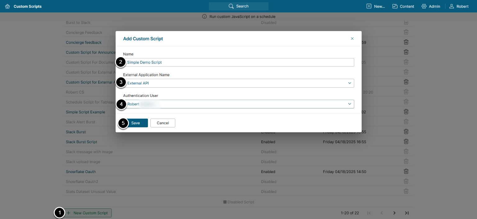- Authentication User: Choose a User on whose on behalf the Custom Script will act