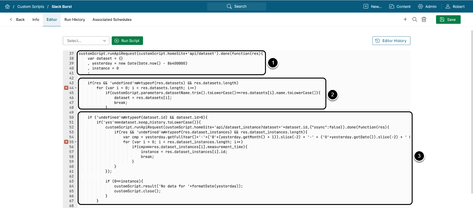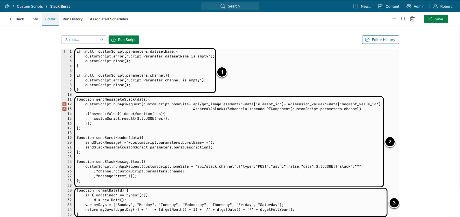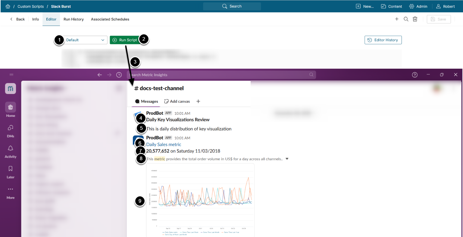 This example demonstrates the usage of Custom Scripts; however, if you want to create a Burst to a Slack channel, a simple approach exists: