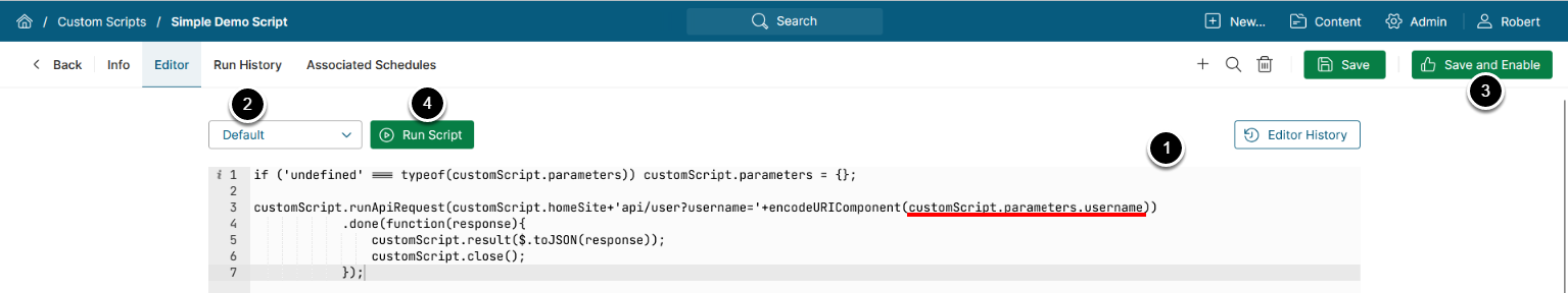 - Enter your script's code- Access Script Parameters using dot notation: customScript.parameters.<parameter_name>