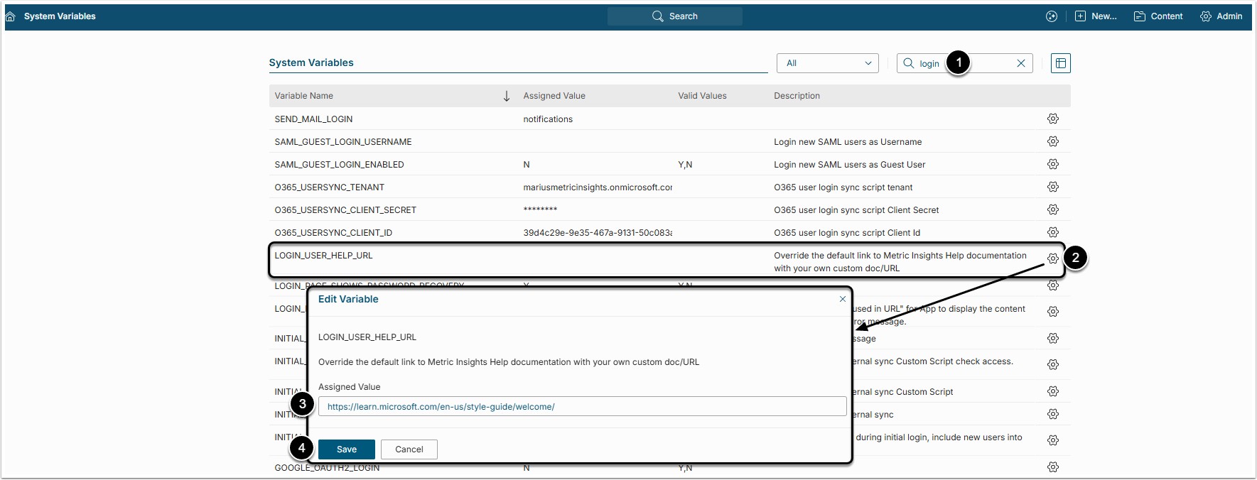- Find LOGIN_USER_HELP_URL Variable and click the gear icon in its row.