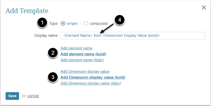 - Click Add Dimension display value to add Dimension Value to the Template. You can choose to make it bold or italic
