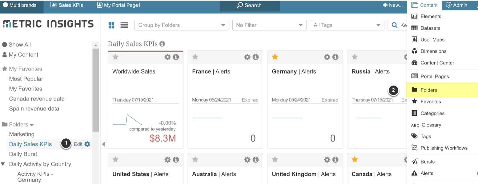 Folders are sections that you add to your Homepage. They hold the tiles and help Users to sort the content. By placing tiles to the Folders, the User can easily access specific information and also receive email digests that provide regular summaries of all updates to the tiles.